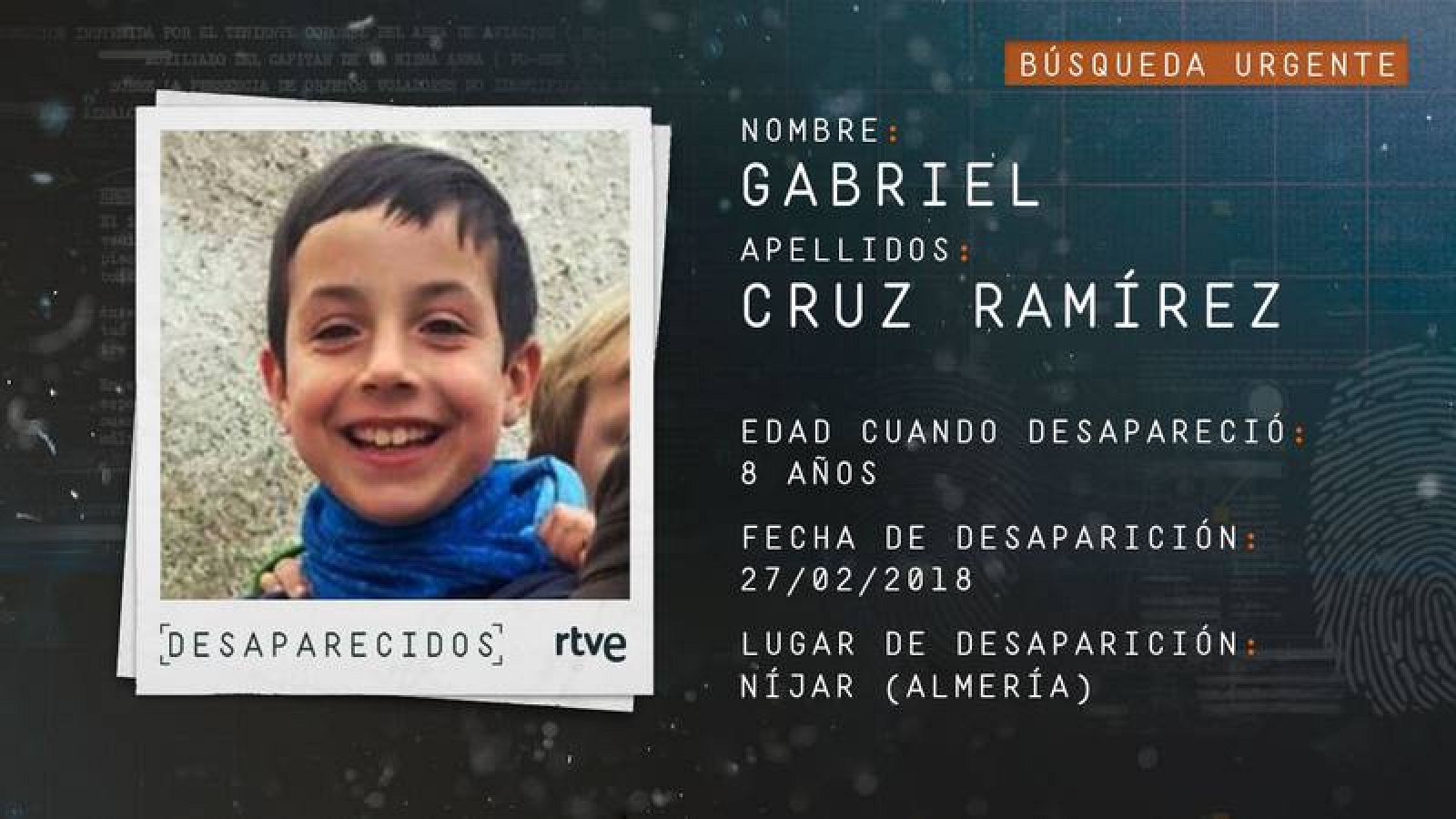 Gabriel desapareció el martes 27 de febrero en la zona de las Hortichuelas en Níjar, Almería. En el momento de su desaparición vestía un pantalón deportivo negro con rayas blancas y una chaqueta roja con capucha.http://www.rtve.es/television/desaparecidos