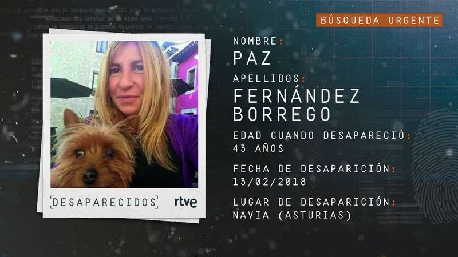 Paz, vecina de Nuevo Roces, fue vista por última vez en la calle San Francisco (Navia). Eran las 23.30 horas y salió de la pensión en la que había reservado alojamiento para una noche. Su inseparable perro yorkshire apareció a la mañana siguiente en esa calle, solo y sin correa y su coche fue localizado en las inmediaciones del Hospital de Jarrio. Su teléfono móvil dio señal por última vez en la localidad de Busmargali, a ocho kilómetros del centro de Navia.